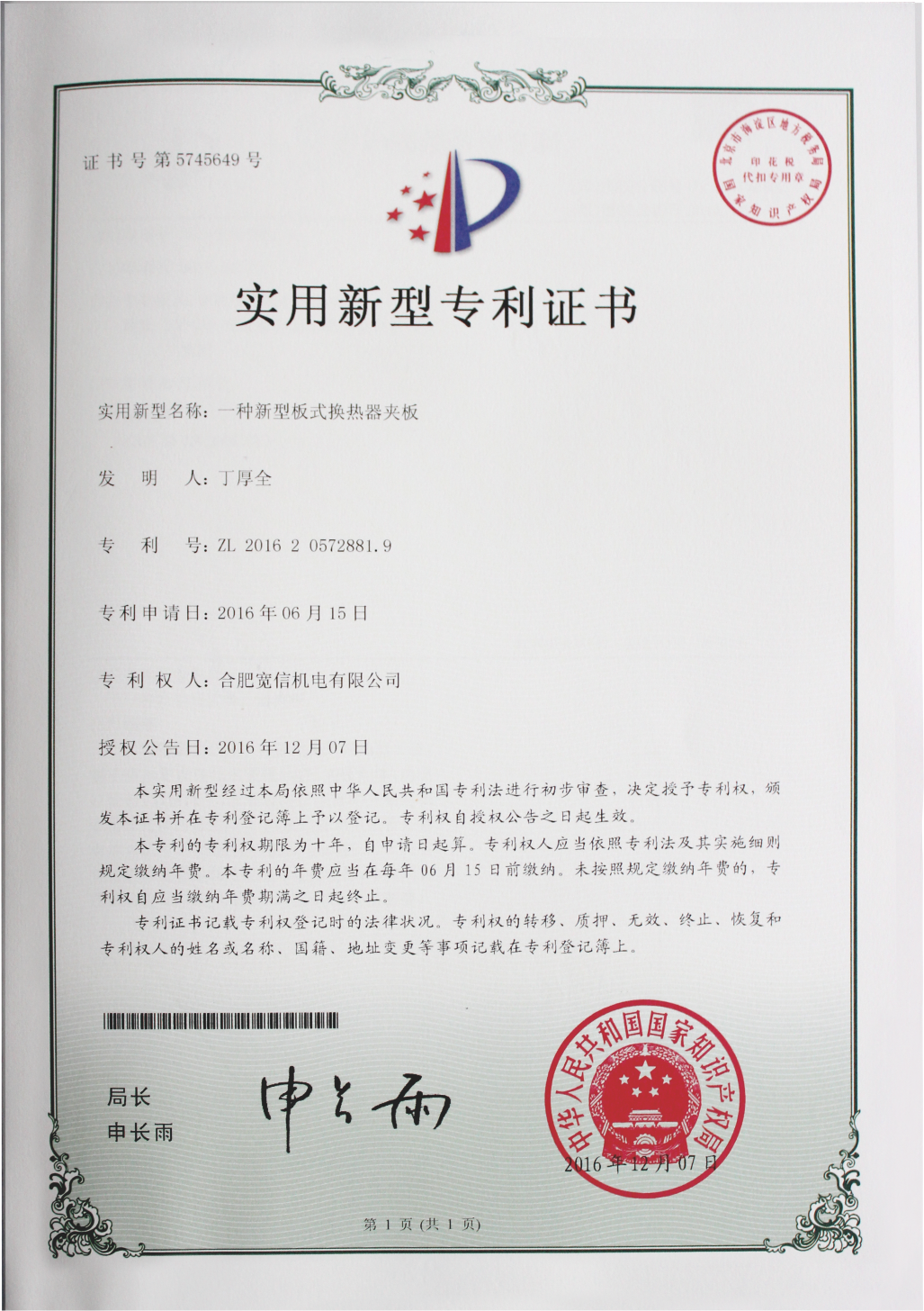 寬信實用新型證書